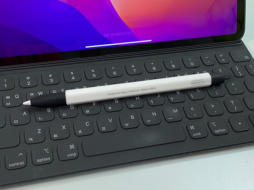 끼우기 전 실리콘 케이스를 자세히 보면 마그네틱이라는 글자가 있는 곳이 케이스의 다른 면보다 얇다. 펜슬을 사진처럼 평평한 부분을 케이스에 얇은 쪽으로 하여 글자가 서로 보이는 방향으로 끼우면 된다. 케이스를 끼우고 나면 패드에 한번 붙여서 충전이 잘되는지 확인해보면 된다. 아직 케이스로 인해 자석이 약해져서 패드에서 펜슬이 떨어져 나간 적은 없다.