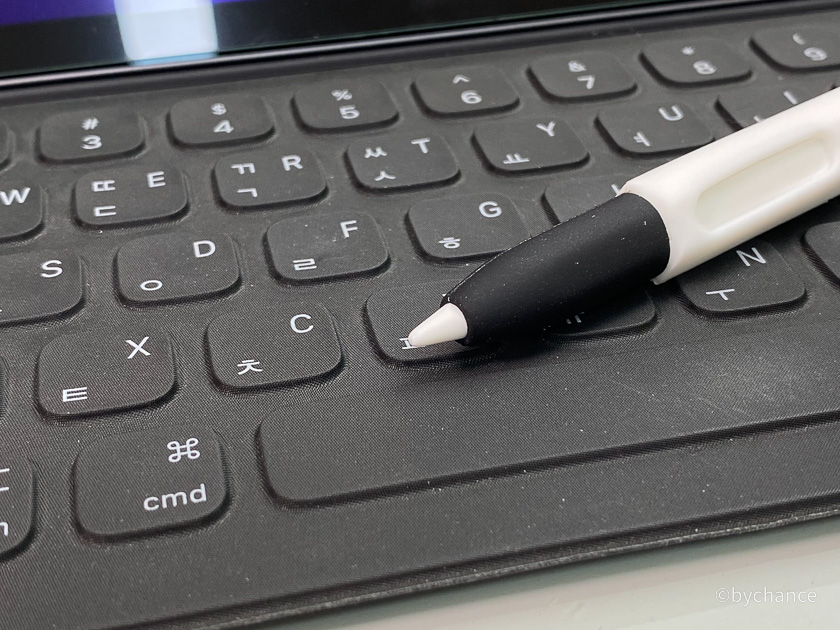 예전이나 지금이나 많이 사용하는 모나미 볼펜 모양을 하고 있어 왠지 아이패드에 펜슬로 필기를 하면 볼펜으로 쓰는 기분을 낼 수 있다. 하지만 펜슬에 케이스를 끼우다 보니 두께감이 많이 느껴진다. 쓰다 보면 생각보다 그리 거슬리지 않는다. 그리고 아이패드에 필기를 하고 있으면 볼펜으로 뭐하냐고 가끔 누가 물어볼 때도 있다. 멀리서 보면 영락없는 모나미 볼펜처럼 보인다.